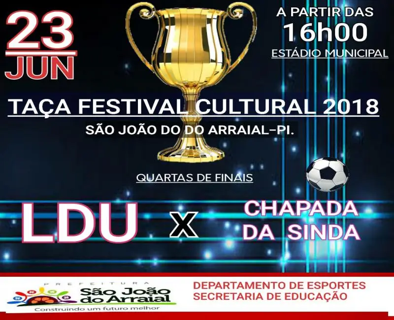 Nesse sábado (23), será realizada a quarta e última partida válida pelas quartas de finais da Copa Taça Festival Cultural 2018. O jogo terá início a partir das 16 horas, no Estádio Municipal de São João do Arraial, e será disputado entre as equipes do LDU e Chapada da Sindá, partida que era para ter sido realizada no último dia 09, e foi adiada.