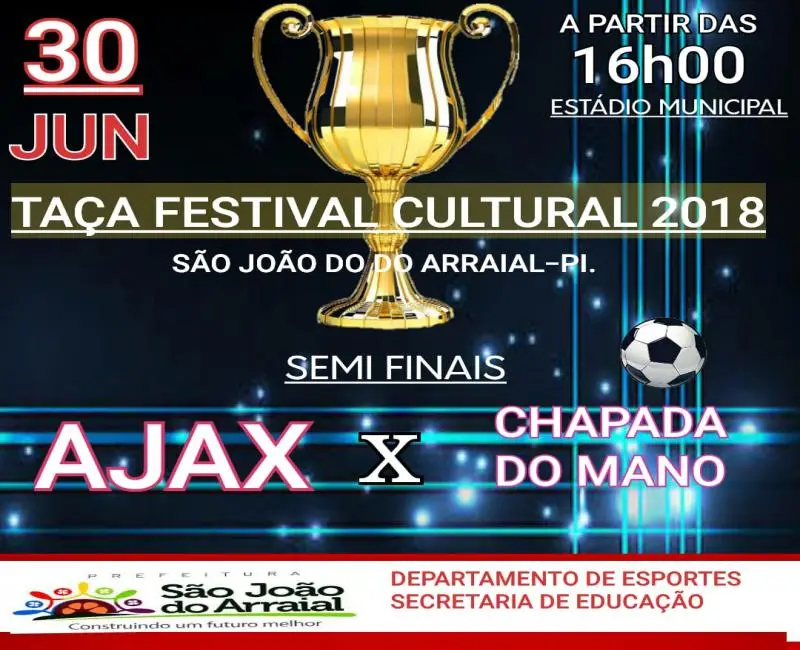 No sábado (30), será realizada primeira partida válida pelas semifinais da Copa Taça Festival Cultural 2018. O jogo terá início a partir das 16 horas, no Estádio Municipal de São João do Arraial, e será disputado entre as equipes do Ajax e Chapadinha do Mano.