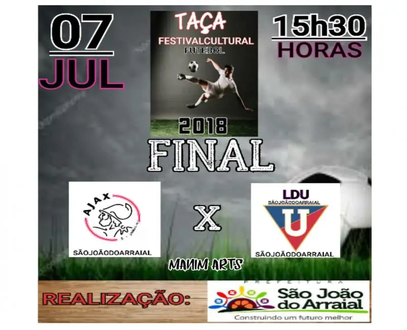No próximo sábado (07), no terceiro dia do XIV Festival Cultural dos Cocais, acontecerá a grande final da Copa Taça Festival Cultural 2018, entre os times do LDU e Ajax. O jogo terá início a partir das 15h30, no Estádio Municipal de São João do Arraial.