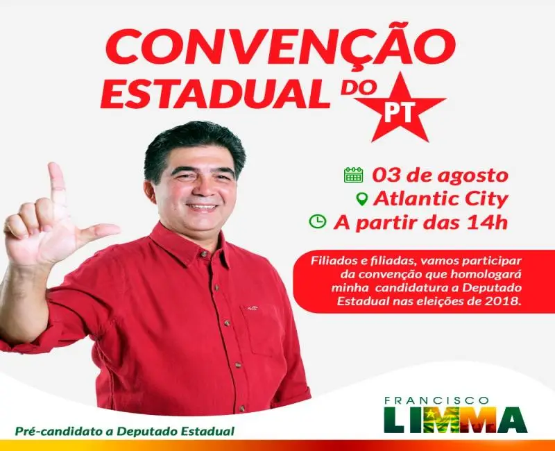 O São Joanense do Arraial, Deputado Estadual e atual líder do governo na Assembleia Legislativa do Piauí (ALEPI) e pré-candidato Francisco Limma (PT), convida a todos os filiados e filiadas, amigos, amigas e simpatizantes, para participarem da Convenção, que deverá homologar a sua candidatura a reeleição.
