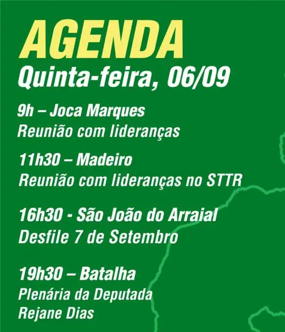 Pela manhã o deputado visitou os municípios de Joca Marques e Madeiro, a tarde estará participando de atividades em São João do Arraial, onde deverá acompanhá o tradicional desfile cívico em homenagem à Independência do Brasil, realizado por estudantes das escolas da rede municipal e estadual de ensino, e participar de conversas com amigos, eleitores e lideranças políticas. A noite o deputado estará participando de atividades na cidade de Batalha.
