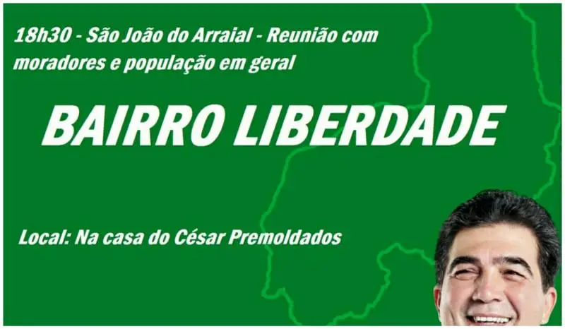 Nessa terça-feira (02) apoiadores do Deputado estadual e candidato a reeleição Francisco Limma (PT), em São João do Arraial, estarão realizando uma palestra no bairro Liberdade, na residência do senhor César premoldados. O evento terá início por volta das 19 horas, e contará com a presença de várias lideranças políticas do município e da região.