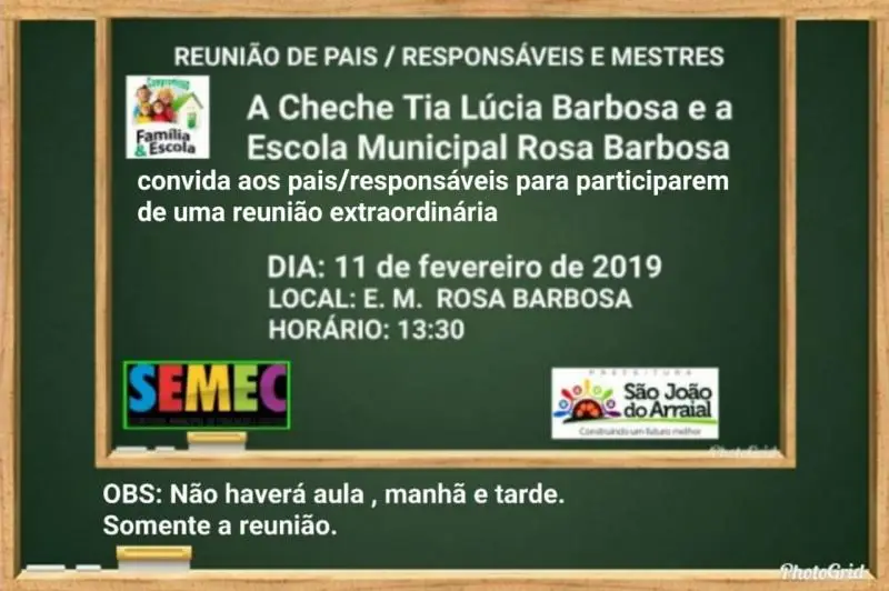 A direção da Escola Municipal Rosa Barbosa e da Creche tia Lúcia Barbosa convida todos os pais ou responsáveis por alunos que estão matriculados na referida escola, para participarem de uma reunião, que será realizada na próxima segunda-feira (11/02), a partir das 13:30, no pátio da escola Rosa Barbosa.