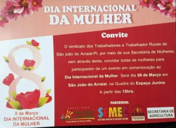 O Sindicato dos Trabalhadores e Trabalhadoras Rurais de São João do Arraial, por meio da Secretaria de Mulheres com parceria da prefeitura municipal, por meio das secretarias municipais, convidam a população para as comemorações do Dia Internacional da Mulher, que será realizado nesta sexta, 08 de março.