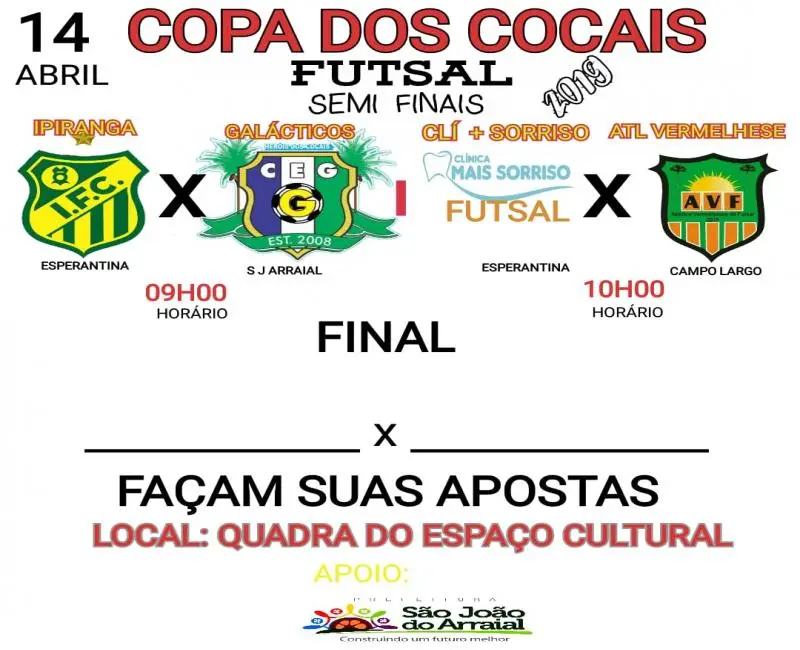 No próximo domingo (14) São João do Arraial será palco de mais duas grandes partidas de futsal. Os jogos decidirão os dois finalistas da Copa Intermunicipal dos Cocais 2019.