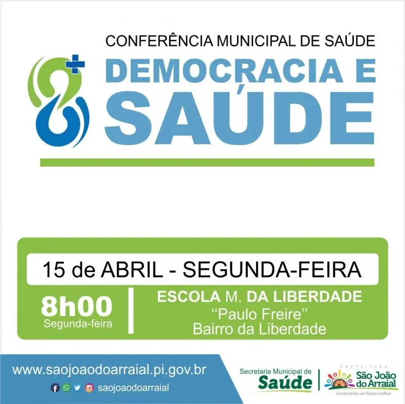A Prefeitura Municipal de São João do Arraial, por meio da secretaria Municipal de saúde, tem a honra de convidar toda a população do município, para participar da VIII Conferência Municipal da saúde, que será realizada na próxima segunda-feira (15), a partir das 08 horas da manhã, na Escola Municipal da Liberdade Paulo Freire, localizada na Avenida Pedro Lopes, no Bairro Liberdade.