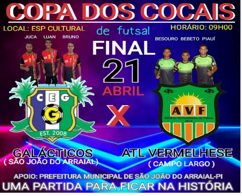 De um lado estará a grande equipe do Galácticos da cidade de São João do Arraial, que vem dando shows de futsal, ao longo da competição, e que conta com o apoio da sua grande torcida, que promete lotar as arquibancadas mais uma vez, para apoiar a equipe da casa. Do outro lado estará a competente equipe do Atlético Vermelhense, da cidade de Campo Largo, que vem mostrando um futsal de alto nível, e que desde o início da competição é considerada a equipe favorita ao título.