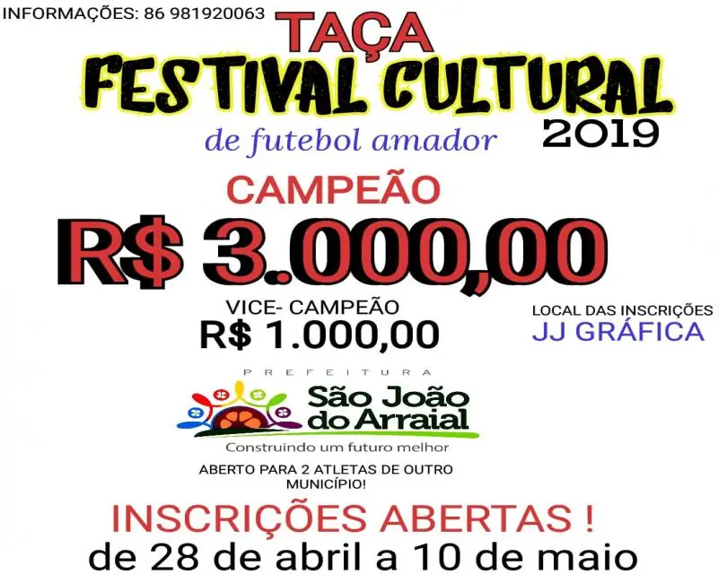 Já estão abertas as inscrições para a maior competição de futebol amador do território dos Cocais, a Copa Taça Festival Cultural 2019, com a premiação de R$ 3.000,00 (três mil reais) para o campeão e R$ 1.000,00 (mil reais) para o segundo colocado.