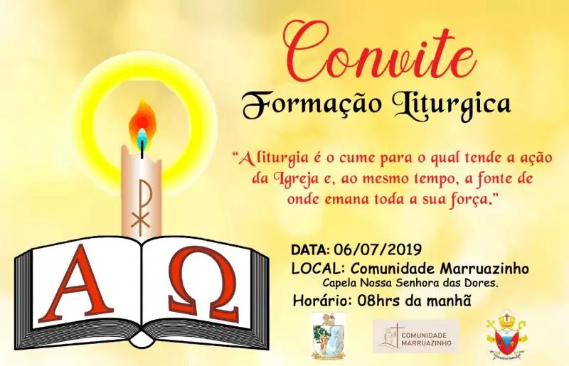 A comunidade Marruazinho, através de sua Coordenação, tem a imensa satisfação de convidar todas as comunidades e coordenadores de toda a Área pastoral São João Batista, a participar de uma formação litúrgica, que será realizada no próximo sábado (06), a partir das 08 horas da manhã, na Capela de Nossa Senhora das Dores.