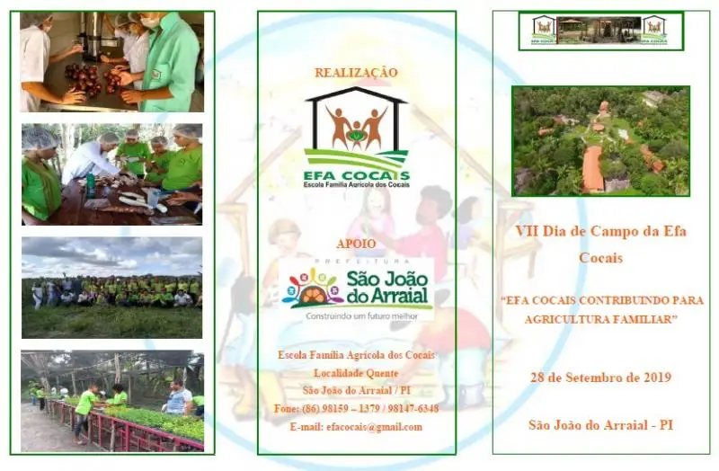 A Escola Família Agrícola dos Cocais tem a satisfação de convidar toda a população de São João do Arraial e demais localidades vizinhas para participar do VII dia de campo da EFA Cocais, que acontecerá no dia 28 de setembro, na referida escola. Na ocasião serão realizadas atividades técnicas e práticas, demonstração de produtos alimentícios farão parte da programação, além de várias outras atividades.