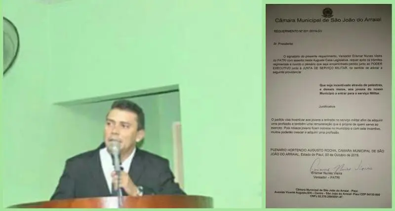 Em Sessão ordinária realizada na última sexta-feira (25) no plenário da Câmara Municipal de São João do Arraial, o vereador Erismar Nunes Vieira (PATRI) apresentou requerimento solicitando ao Poder executivo Municipal junto à Junta do Serviço Militar, que sejam realizadas palestras e demais meios de incentivo aos jovens do Município de São João do Arraial a entrar para o Serviço Militar.