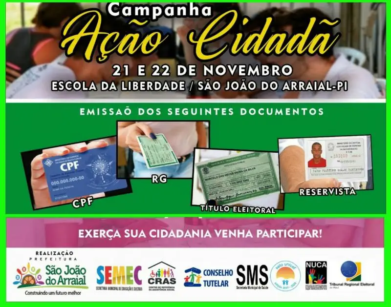 A Prefeitura de São João do Arraial, por meio da Secretaria Municipal de Educação e Cultura (SEMEC), Secretaria Municipal de Assistência Social e demais parceiros, promoverá nessa quinta-feira (21) e sexta-feira (22), uma ação cidadã da juventude. A ação terá início a partir das 08 horas da manhã, na Escola Municipal da Liberdade Paulo Freire.