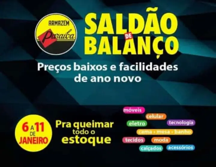 Começou a super promoção "saldão de balanço Paraíba", São descontos em todos os setores da loja, inclusive no setor de celulares, divididos em até 1+5X no cartão Paraíba e em 5X no cartão de crédito.