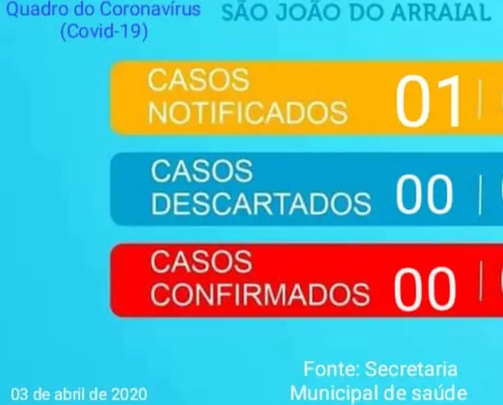 Informações repassadas pela Secretaria Municipal de Saúde de São João do Arraial na noite desta sexta-feira (03) mostram que o município segue sem nenhum caso confirmado de Covid-19 (Coronavírus). Até esta data teve apenas um caso notificado, e ainda está em observação, esperandoo resultado do exame.
