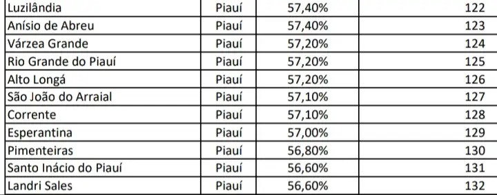 No fim da fila, contrariando as orientações para que a população fique em casa durante a validade das medidas restritivas do governo, aparecem São Gonçalo do Gurgueiacom apenas 38% e Jacobina do Piauí com 39,5%. Eliseu Martins também figura entre as cidades que registraram os menores índices de isolamento social, com 46,40%.