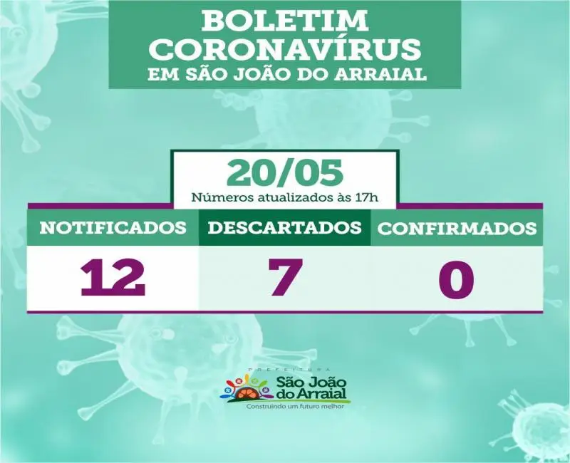 O boletim atualizado nesta quarta-feira (20) traz um novo caso suspeito de coronavírus em São João do Arraial. O município tem 12 casos notificados, sendo que 07 já foram descartados.