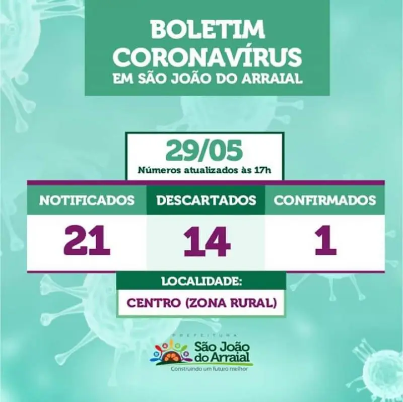 O município de São João do Arraial continua com apenas um caso confirmando do Novo Coronavírus (Covid-19). O número de suspeitos subiu para 06.