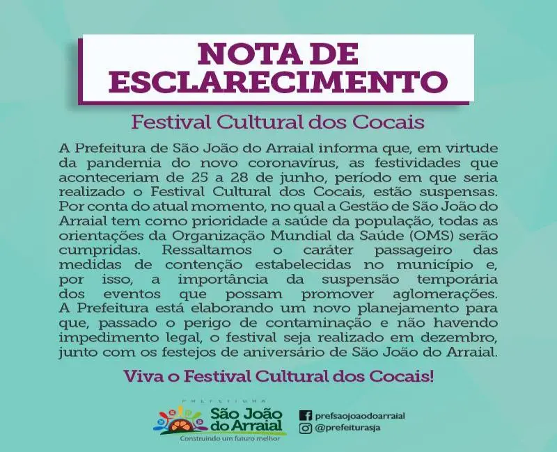 A Prefeitura de São João do Arraial anunciou, nesta quarta-feira, que a 16ª edição Festival Cultural dos Cocais, maior encontro de cultura da região dos Cocais, está suspensa. A decisão de adiar as festividades acontece em virtude da pandemia do coronavírus, seguindo as orientações da Organização Mundial de Saúde (OMS), como medida para evitar aglomerações e, por consequência, a possibilidade de infecção pelo vírus causador da doença covid-19.