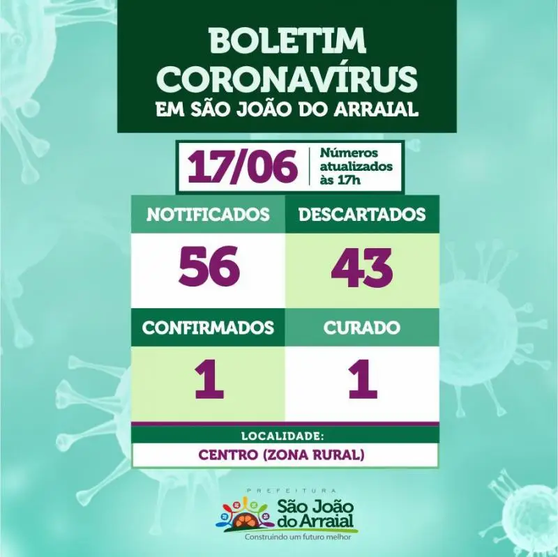 A Secretaria Municipal de saúde de São João do Arraial divulgou uma nota, onde afirma que não existe nenhum novo caso confirmado do Novo Coronavírus (Covid-19) no município.