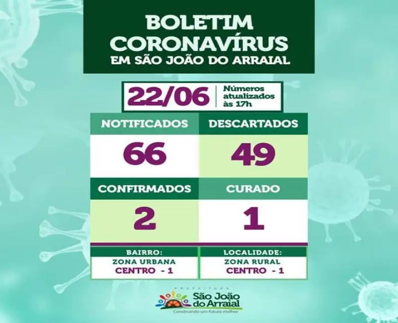 De acordo com o boletim divulgado no nesta segunda-feira (22), pela secretaria Municipal de saúde de São João do Arraial, o município registrou mais um caso confirmado para o Novo Coronavírus (Covid-19).