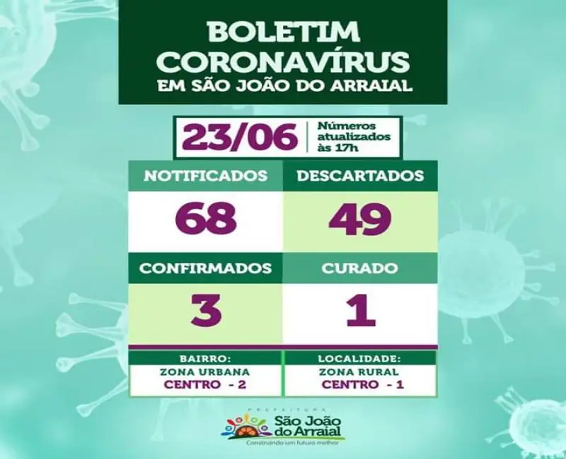De acordo com o boletim divulgado no final da tarde desta terça-feira (23) pela secretaria Municipal de saúde de São João do Arraial, o município registrou o terceiro caso confirmado do Novo Coronavírus (Covid-19).