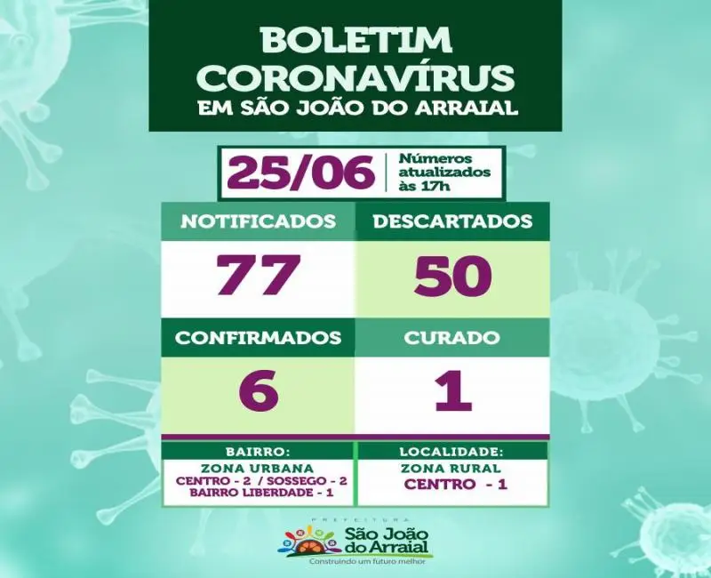 De acordo com o boletim divulgado na tarde desta quinta-teria (25), pela secretaria Municipal de saúde de São João do Arraial, o munícipio registrou mais dois novos casos positivos para o Novo Coronavírus (Covid-19).