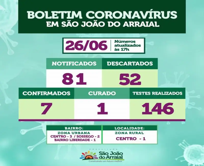 De acordo com o boletim divulgado na tarde desta sexta-feira (26), pela secretaria Municipal de saúde de São João do Arraial, o município registrou um novo caso confirmado para a covid-19.