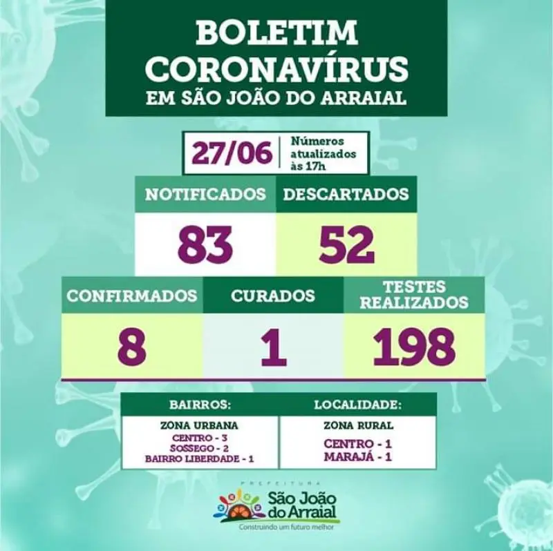 De acordo com o boletim divulgado na tarde deste sábado (27), pela secretaria Municipal de saúde de São João do Arraial, o município registrou mais um caso positivo para a covid-19.