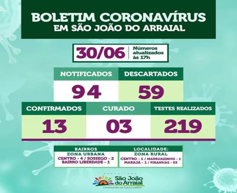 De acordo com o boletim divulgado nesta terça-feira (30), pela secretaria Municipal de saúde de São João do Arraial, o município registrou mais 04 novos casos confirmados para covid-19, totalizando 13 casos no município.
