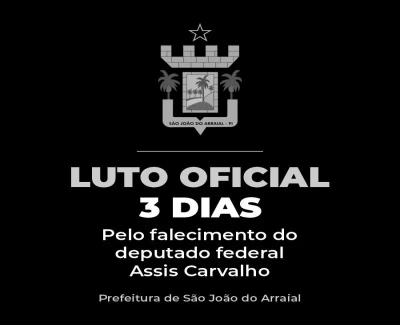 A prefeita Vilma Lima, em nome da Administração Municipal, decretou luto oficial de três dias em São João do Arraial. O luto oficial inicia nesta segunda-feira (6), em razão do falecimento do deputado federal Assis Carvalho, ocorrido na tarde de ontem (5).