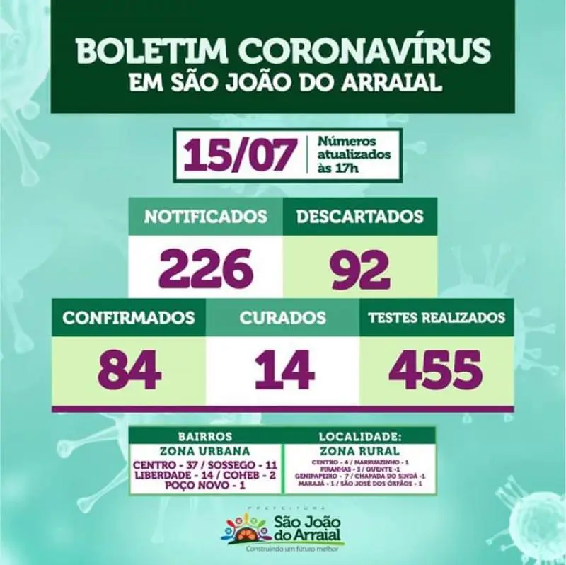 De acordo com o boletim divulgado nesta quarta-feira (15), pela secretaria Municipal de saúde de São João do Arraial, o município registrou sete novos casos confirmados para a covid-19. De acordo com a Secretaria, todos os pacientes apresentam sintomas leves e já estão em isolamento domiciliar.