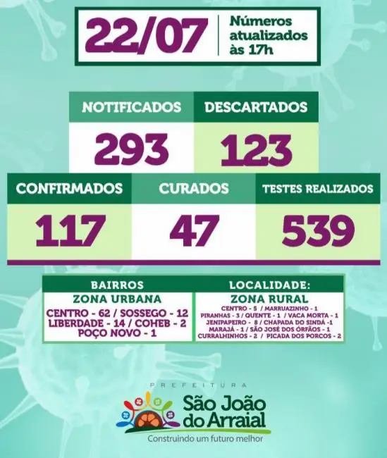 De acordo com o boletim divulgado nesta quarta-feira (22), pela secretaria Municipal de saúde de São João do Arraial, o município registrou dois novos casos confirmados para a covid-19 e seis pacientes curados da doença.