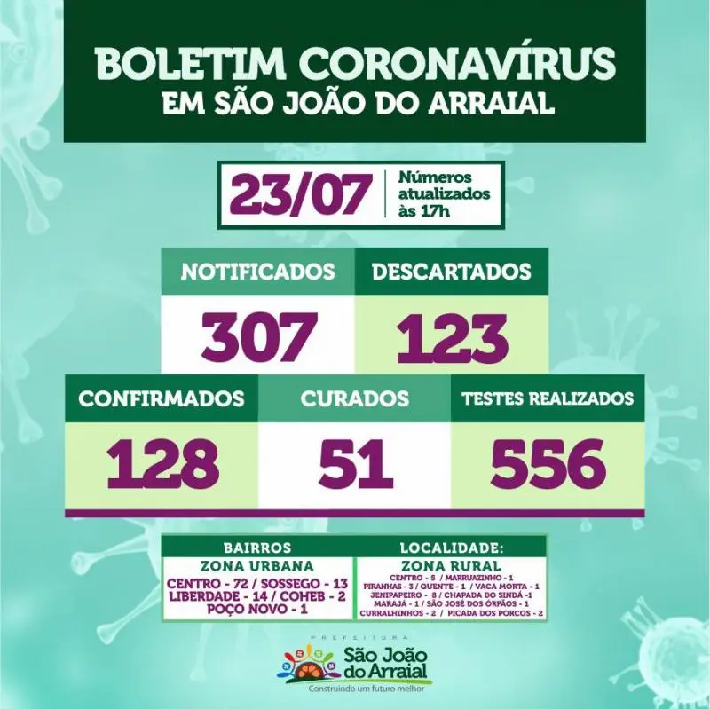 De acordo com o boletim divulgado nesta quinta-feira (23), pela secretaria Municipal de saúde de São João do Arraial, o município registrou 11 novos casos confirmados para a covid-19.