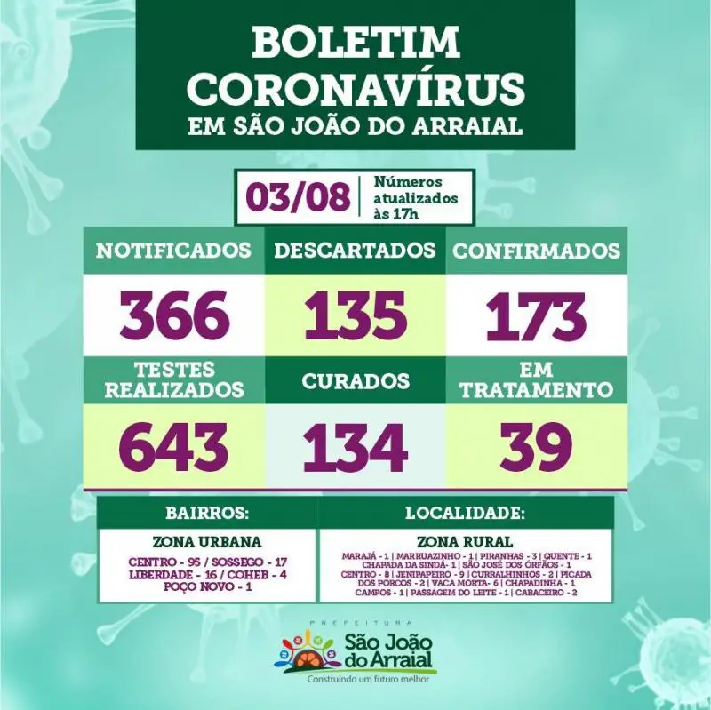 De acordo com o boletim divulgado nesta segunda-feira (03), pela secretaria Municipal de saúde de São João do Arraial, o município registrou seis novos casos da covid-19.