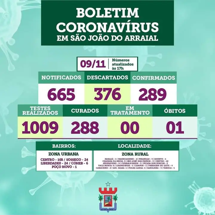 A Secretaria de Saúde de São João do Arraial divulgou novos dados sobre casos de covid-19 na cidade. Nesta segunda-feira (09), o município zerou o número de casos ativos. Dos 289 pacientes positivados, 288 estão curados. A crescente no número de casos recuperados representa mais de 99% do número total.
