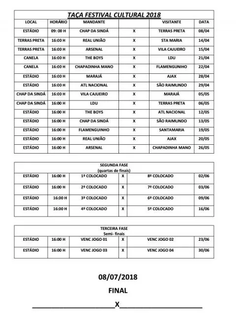 Confira a tabela de jogos da Copa Taça Festival Cultural 2018
