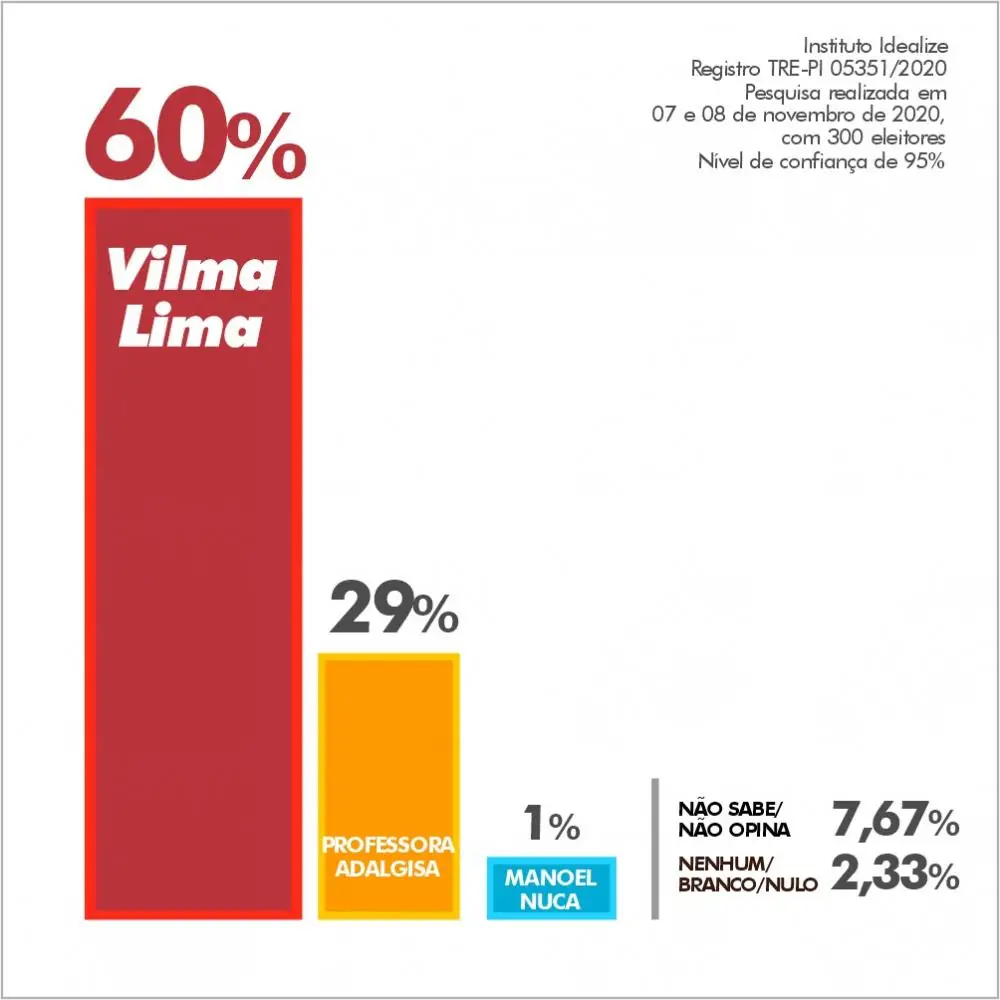 Vilma Lima mantém grande margem de distância da adversária, somando 60%. A segunda colocada, Professora Adalgisa, tem apenas 29%. Manoel Nunca vem em terceiro, com 1%. Não Sabe/Não Opina são 7,67% e Nenhum/Branco/Nulo, 2,33%.
