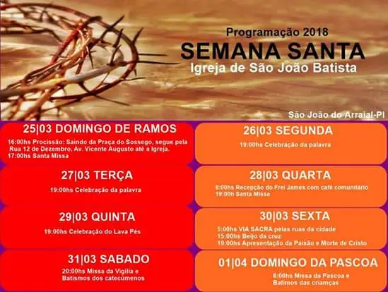Hoje, Domingo de Ramos (25): 16 horas, procissão saindo da praça do Sossego, seguindo pela rua 12 de Dezembro, Avenida Vicente Augusto até a Igreja.