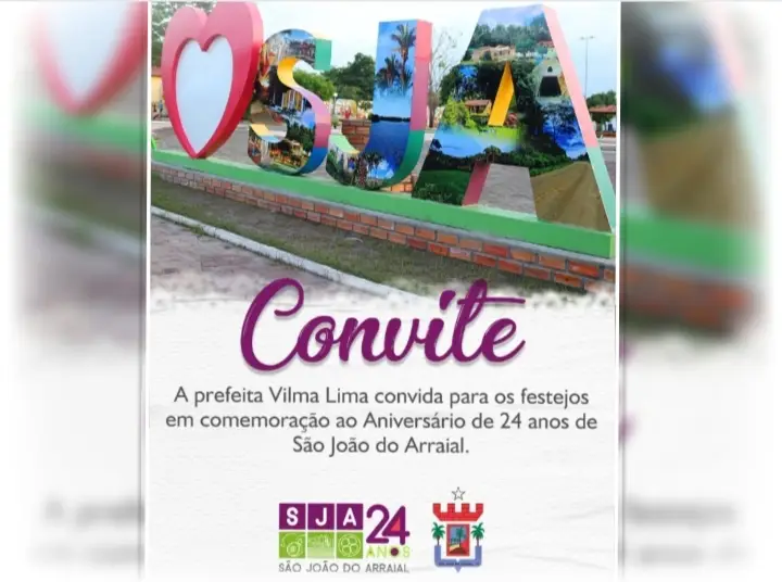 A prefeita Vilma Lima, o Vice-prefeito Francisco Onofre, vereadores, secretários e secretárias municipal, tem o prazer em convidar você e sua família para participarem das comemorações alusivas ao 24º Aniversário de emancipação política do município de São João do Arraial, que terá início nesse sábado 12 de dezembro, e segue até o dia 01 de janeiro de 2021, como mostra a programação divulgada nesta quinta-feira (10) pela prefeitura municipal.
