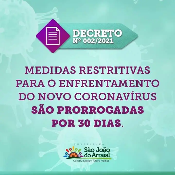 A Prefeitura de São João do Arraial publicou, nessa quinta-feira (21), o Decreto Municipal nº 002/2021, que prorroga as medidas de enfrentamento ao coronavírus no município por 30 dias.