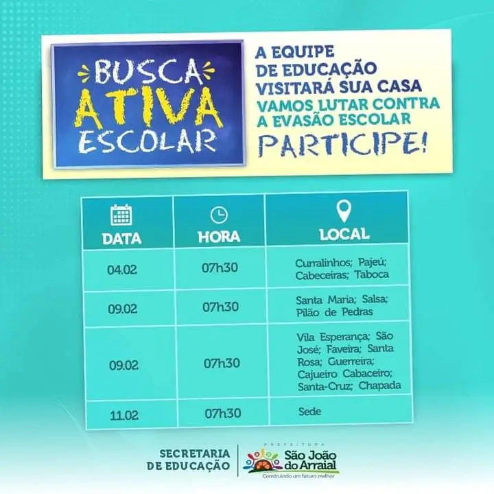 A Prefeitura de São João do Arraial inicia nesta quinta-feira (04) a I Busca Ativa Escolar. A iniciativa da Secretaria Municipal de Educação e Cultura visa combater a evasão escolar, apresentando o protocolo de segurança contra a Covid-19 e estimulando pessoas de dois a 59 anos a frequentar as aulas.