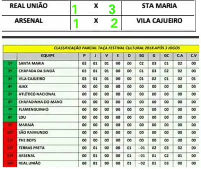 Depois de três jogos realizados, a classificação está da seguinte maneira: Santa Maria, Chapada da Sindá e Vila Cajueiro dividem as primeiras posições na tabela, com 3 pontos cada equipe, e as equipes do Real União, Arsenal e Terras Preta dividem as três últimas posições, com 0 pontos. As demais equipes ainda não estreiaram na competição.