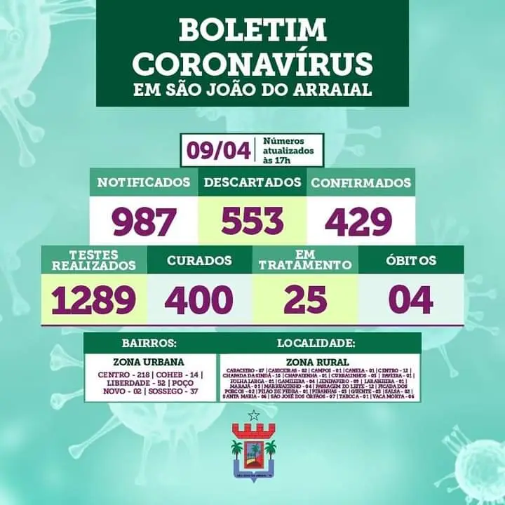 De acordo com o Boletim Epidemiológico desta sexta-feira (09), São João do Arraial registrou 22 casos de Covid-19 nas últimas 24 horas.