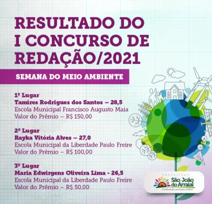 A Prefeitura de São João do Arraial divulgou, nesta sexta-feira (11), o resultado do I Concurso de Redação “Meio Ambiente e Minha Cidade”, realizado pela Secretaria Municipal de Agricultura e Meio Ambiente juntamente com a Secretaria Municipal de Educação.
