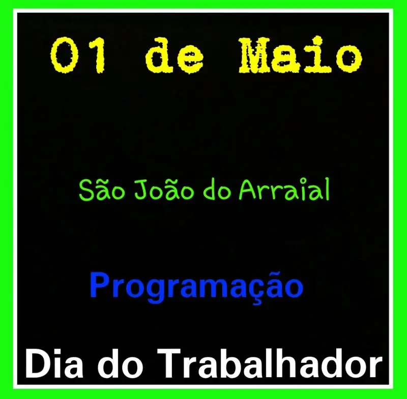 A Prefeitura Municipal de São João do Arraial divulgou nesta segunda feira (30), a programação de todas as atividades que serão realizadas na terça feira (01), durante as festividades em comemoração ao dia do Trabalhador. As atividades terão início a partir das 8:00 h da manhã, e continuarão durante todo o dia e início da noite.