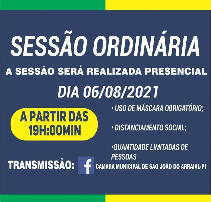 A sessão acontecerá nesta sexta-feira (06), a partir das 19 horas, com transmissão ao vivo pela página oficial da Câmara Municipal de São João do Arraial-PI, no Facebook. Toda a população é convidada a assistir a sessão de retorno das atividades do Poder Legislativo municipal de São João do Arraial.