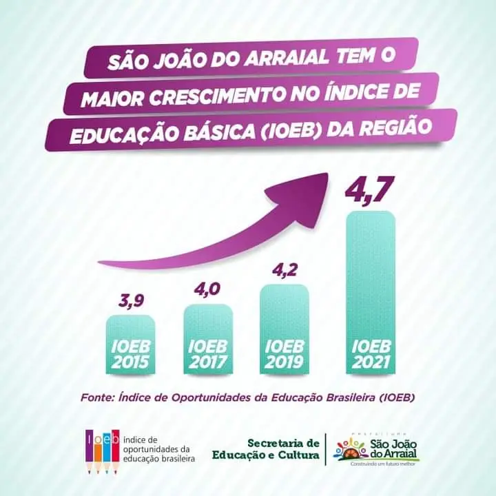 Entre a edição 2019 do Índice de Oportunidades da Educação Brasileira (IOEB) e a de 2021, o município cresceu 0,5 pontos na nota geral. São João do Arraial recebeu 3,9 na primeira edição, em 2015. Em 2017, 4,0; em 2019, 4,2; e em 2021, obteve a média 4,7.