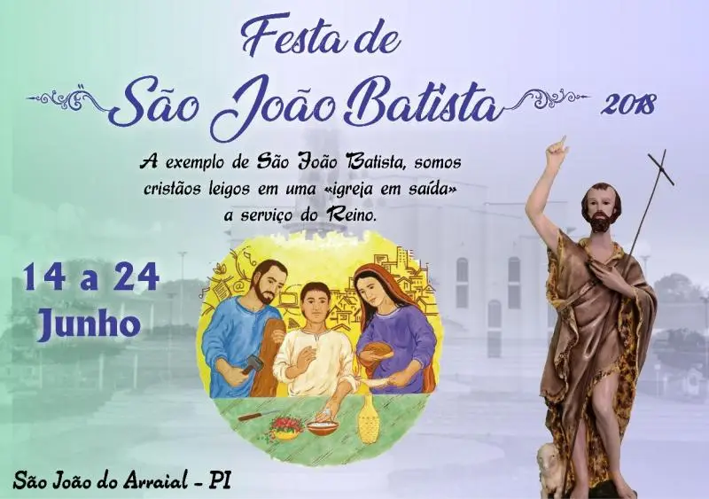 O Conselho Pastoral da Comunidade de São João Batistas da Cidade de São João do Arraial, divulgou recentemente a programação dos festejos de São João Batista. Este ano o tema será: A Exemplo de São João Batista, somos cristãos leigos, em uma “igreja em saída”, a serviço do Reino.