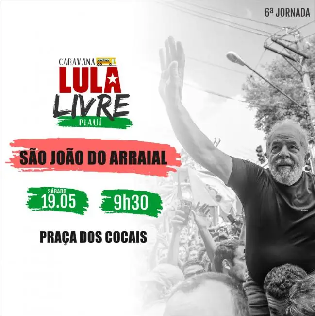 A Caravana "Lula livre" estará percorrendo Municípios da região dos Cocais, no próximo sábado (19), e em São João do Arraial a concentração vai ser na Praça Hortêncio Augusto Rocha (Pracinha dos Cocais), no Centro da Cidade, a partir das 9h30.