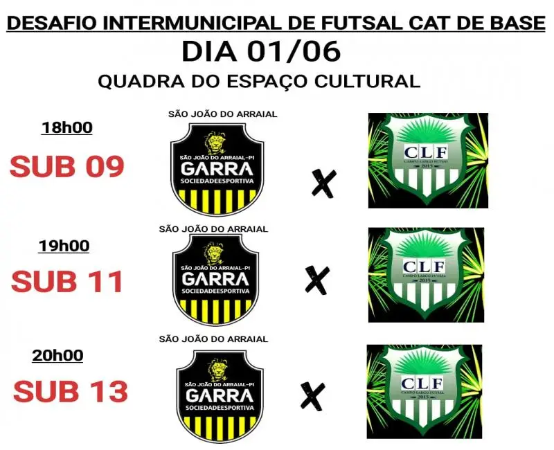 Nessa sexta-feira (01), será realizado o Desafio Intermunicipal de Futsal, categoria de base, em São João do Arraial, entre as equipes sub 09, sub 11 e sub 13 do Garra SJA de São João do Arraial e a equipe de Campo Largo. Os jogos terão início a partir das 18 horas, na quadra do Espaço Cultural dos Cocais.
